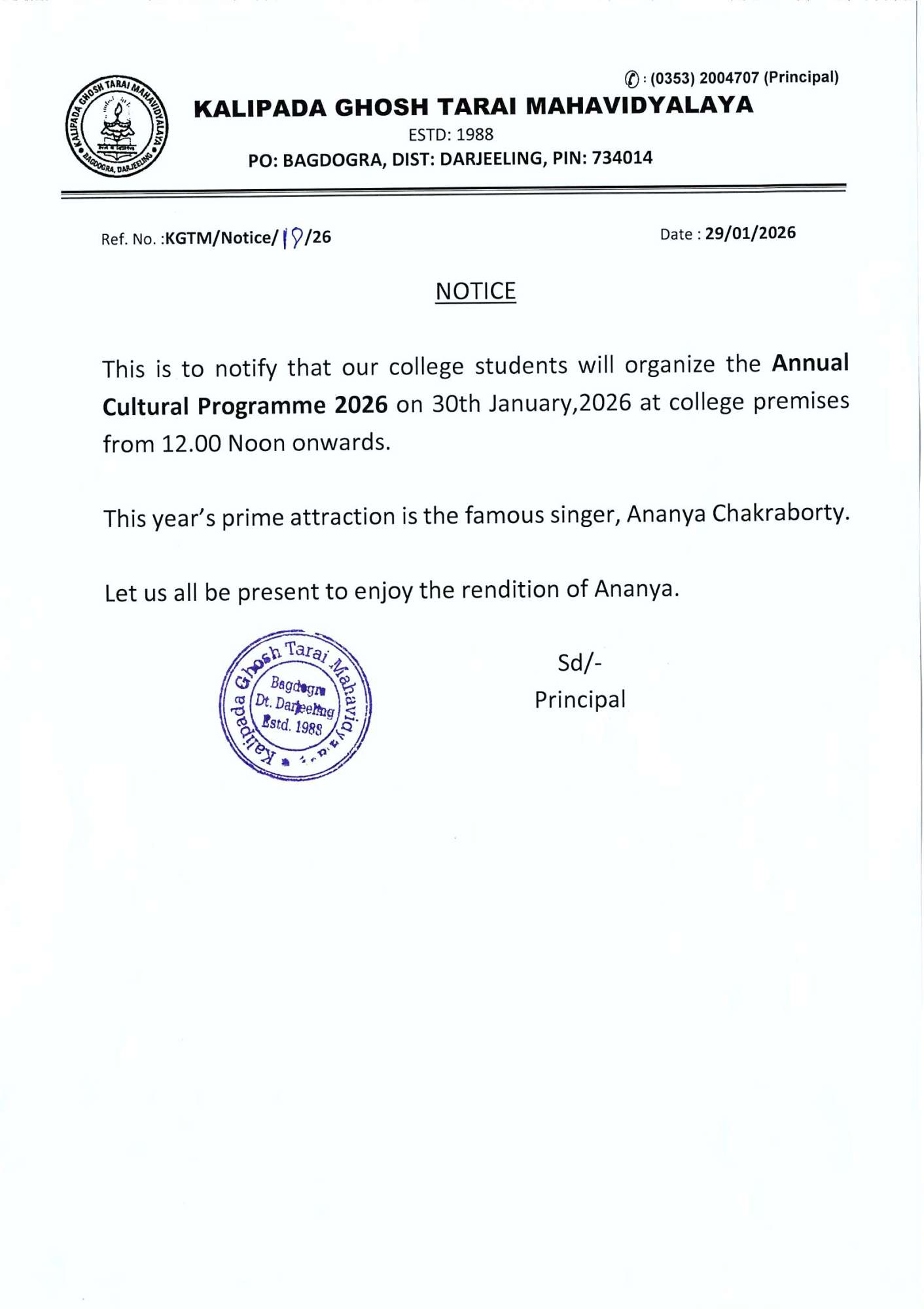 Kalipada Ghosh Tarai Mahavidyalaya, P.O. Bagdogra, Dist. Darjeeling, West Bengal, India-734014