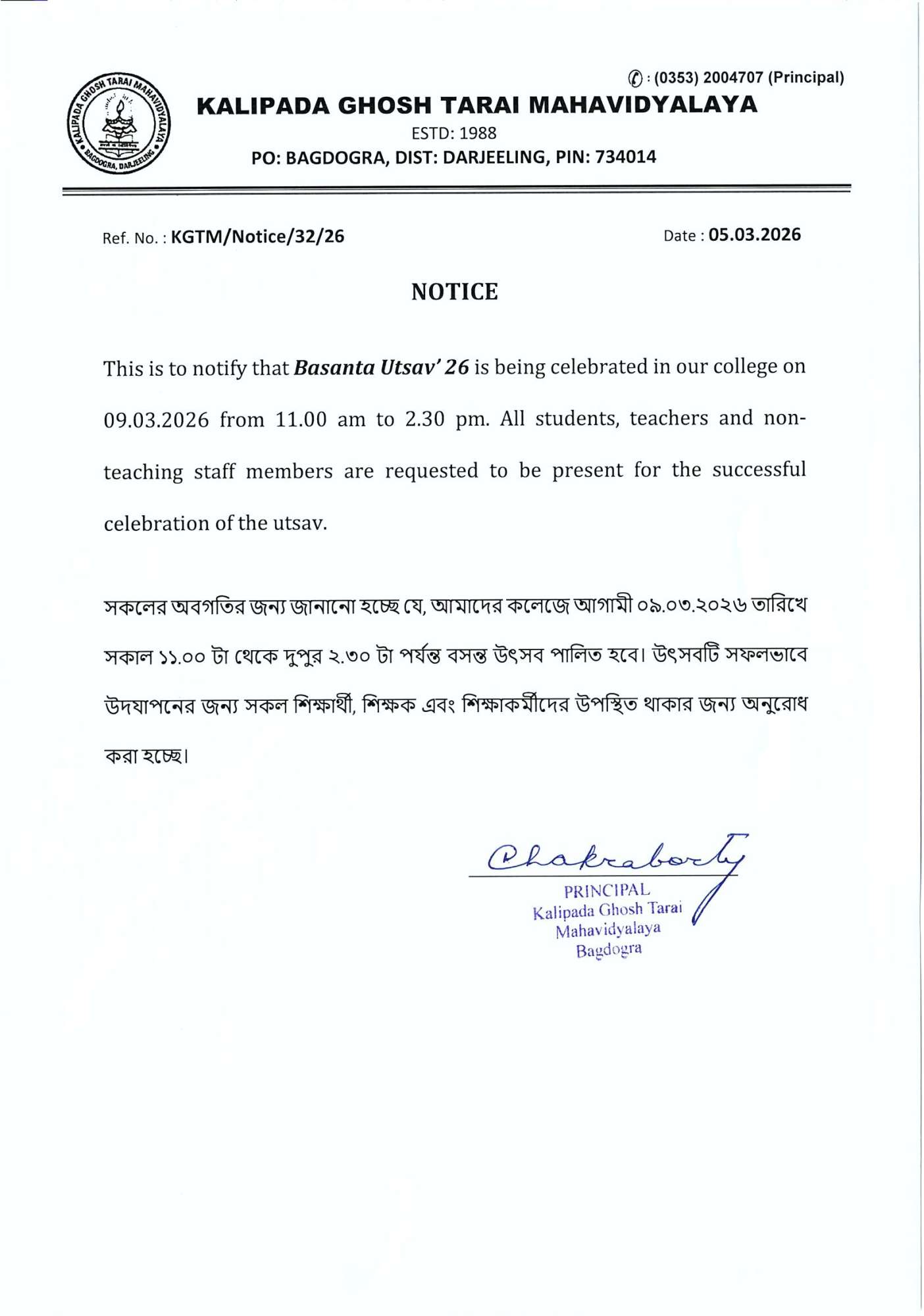 Kalipada Ghosh Tarai Mahavidyalaya, P.O. Bagdogra, Dist. Darjeeling, West Bengal, India-734014