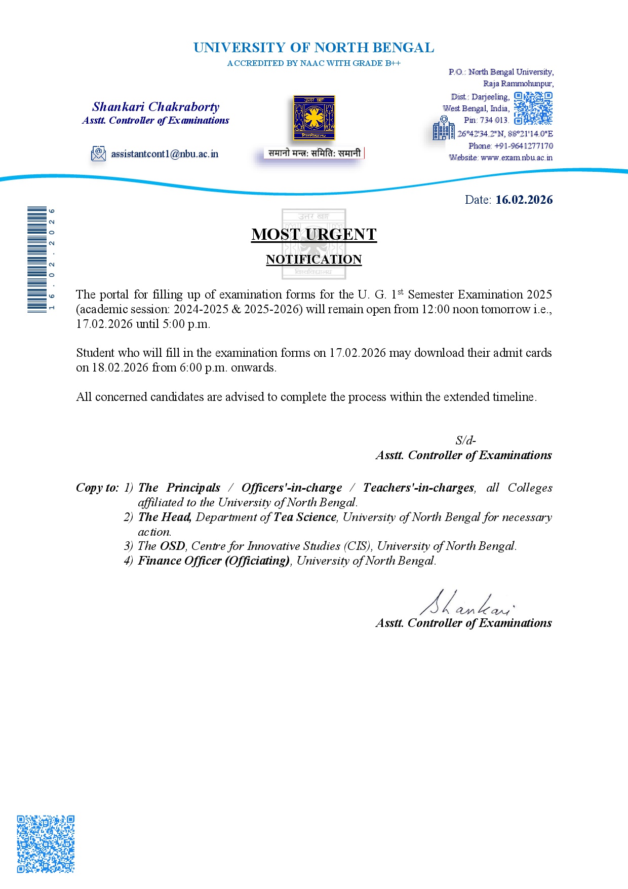 Exam form fill-up extension dates 1st Sem Back & Regular Final Exam