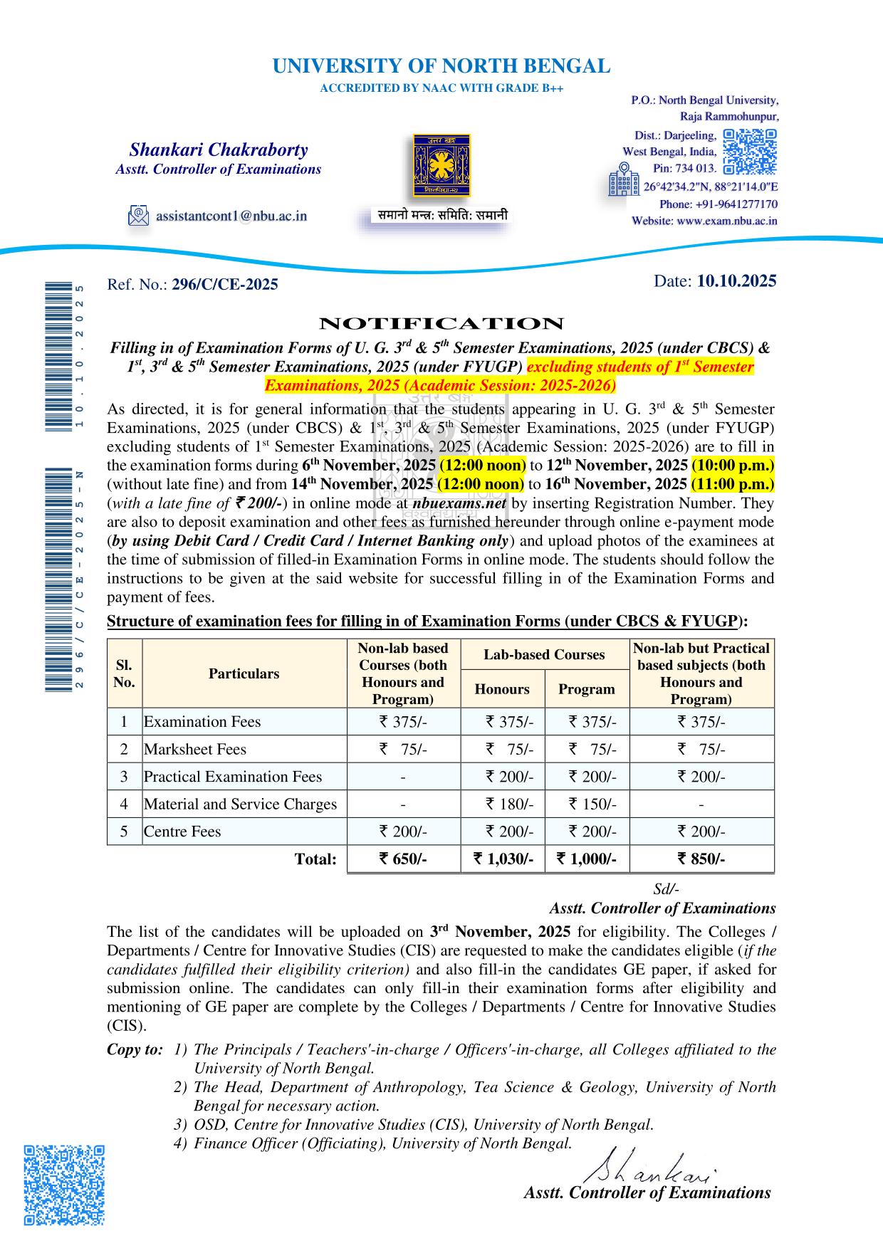 Exam Form Fill up Notice for 1st(Back & Casual), 3rd & 5th Sem Exam 2025