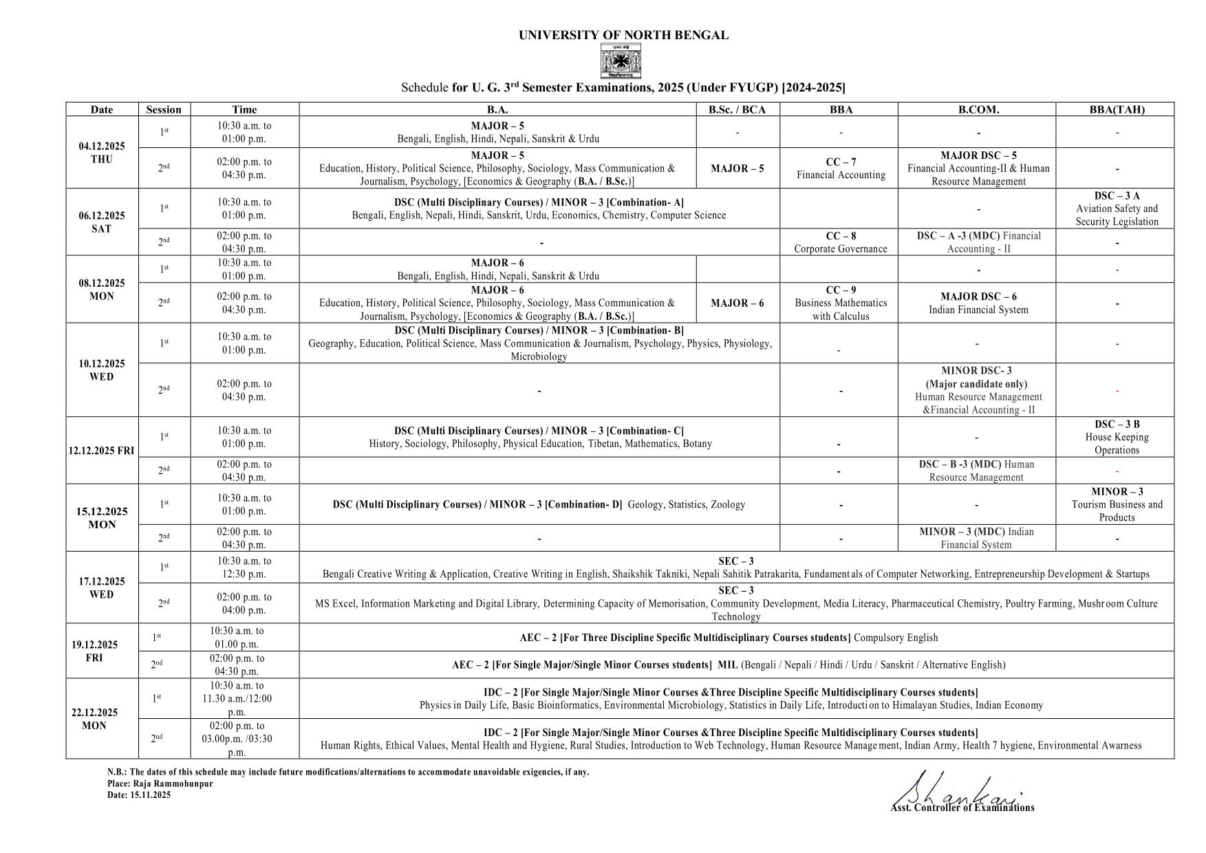 Schedule for U. G. 3rd Semester Examinations, 2025 (Under FYUGP) [2024-2025]