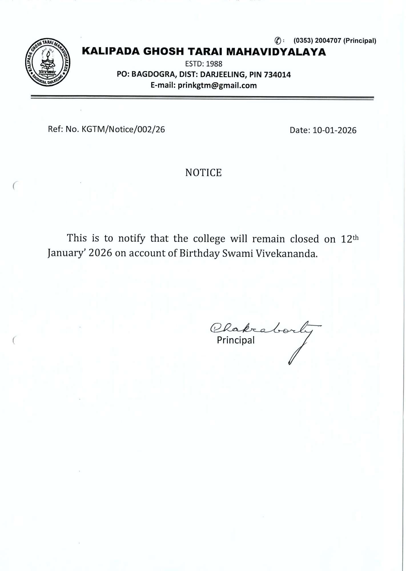 Kalipada Ghosh Tarai Mahavidyalaya, P.O. Bagdogra, Dist. Darjeeling, West Bengal, India-734014