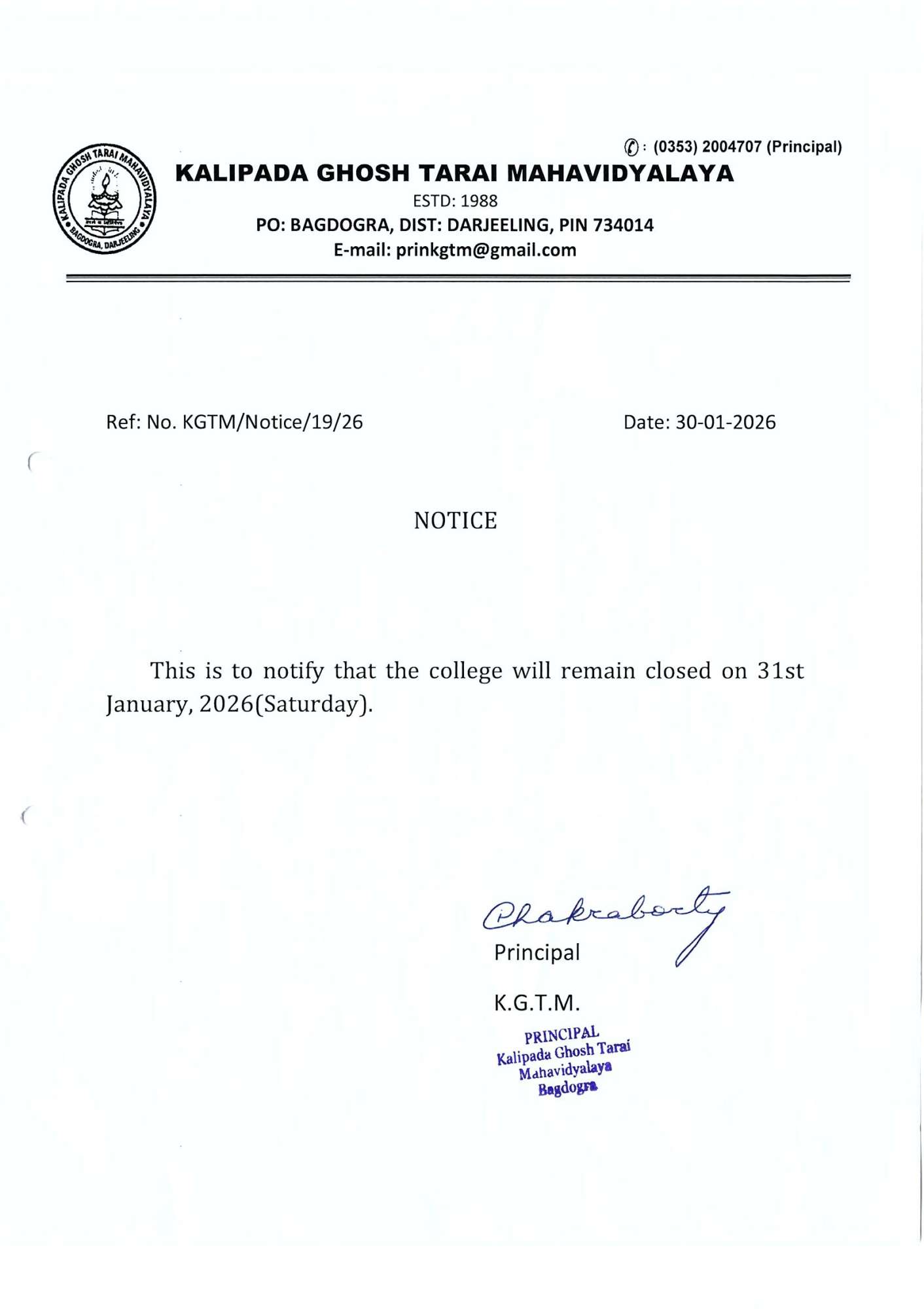 Kalipada Ghosh Tarai Mahavidyalaya, P.O. Bagdogra, Dist. Darjeeling, West Bengal, India-734014