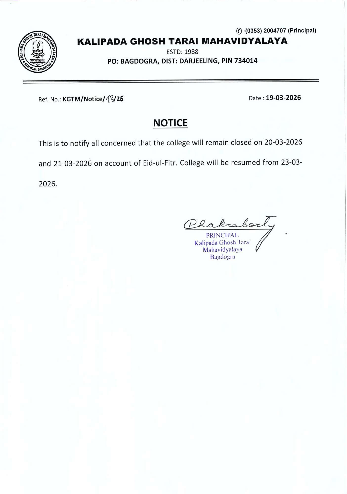 Kalipada Ghosh Tarai Mahavidyalaya, P.O. Bagdogra, Dist. Darjeeling, West Bengal, India-734014