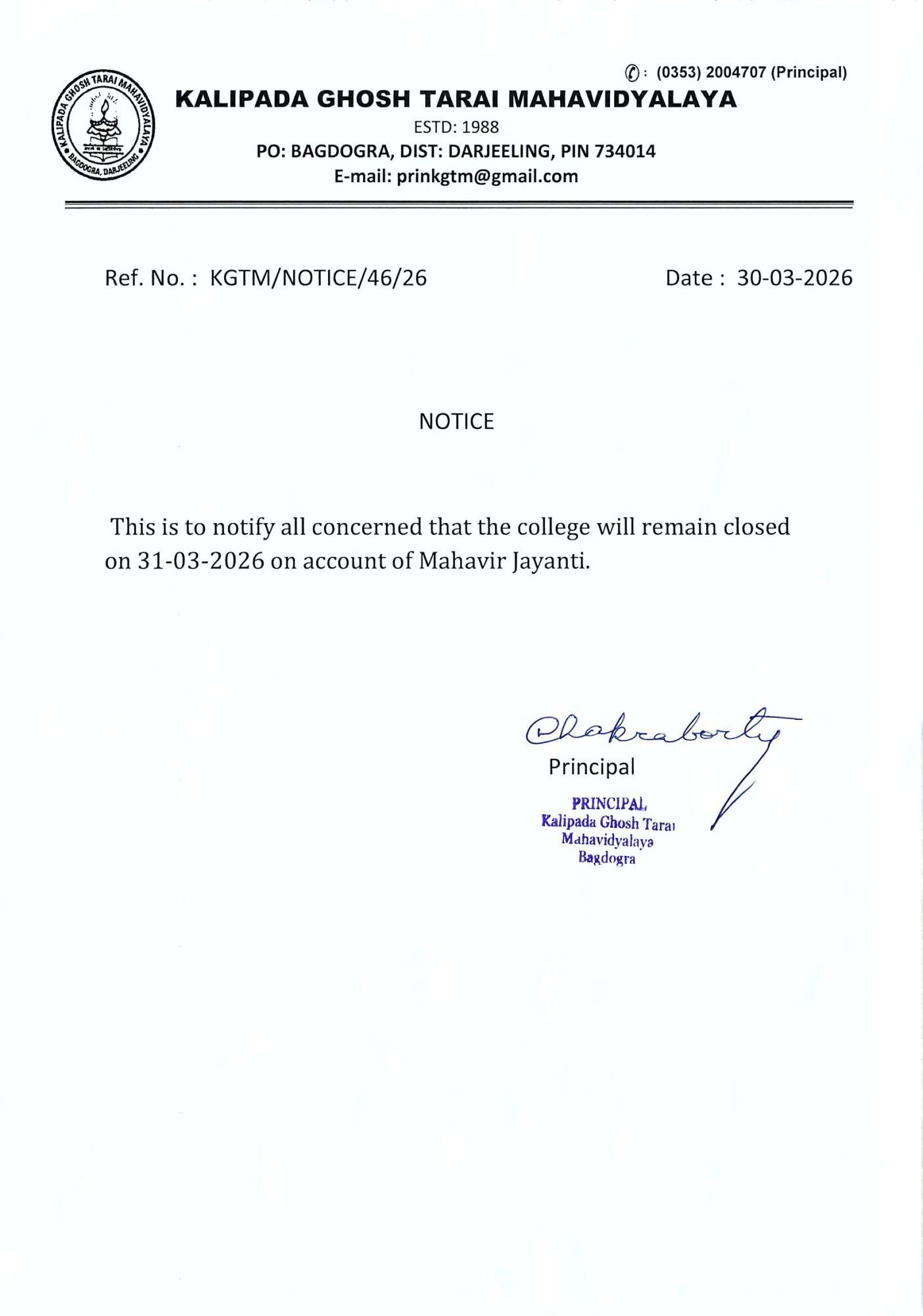 Kalipada Ghosh Tarai Mahavidyalaya, P.O. Bagdogra, Dist. Darjeeling, West Bengal, India-734014
