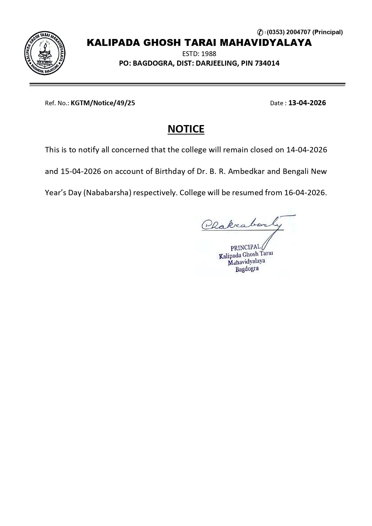 Kalipada Ghosh Tarai Mahavidyalaya, P.O. Bagdogra, Dist. Darjeeling, West Bengal, India-734014