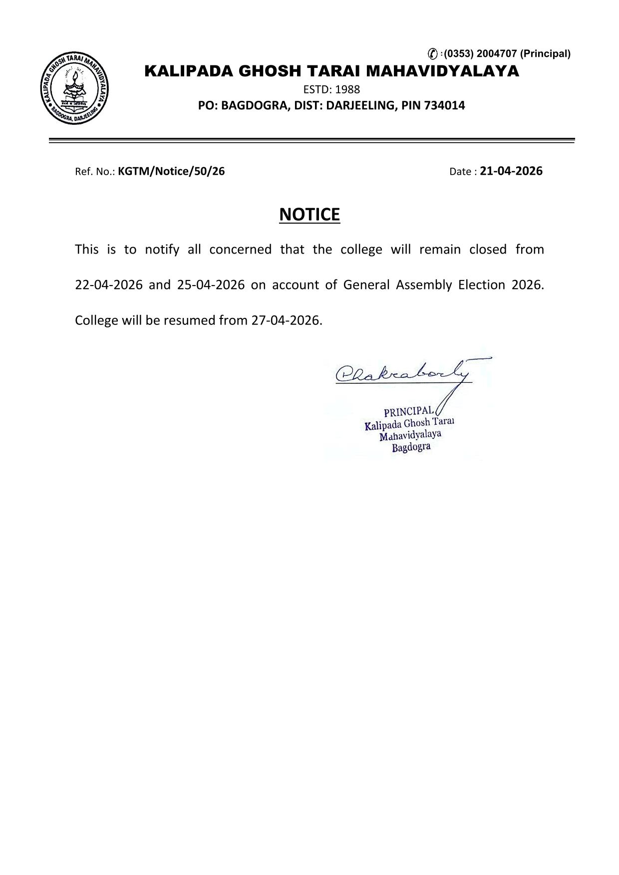 Kalipada Ghosh Tarai Mahavidyalaya, P.O. Bagdogra, Dist. Darjeeling, West Bengal, India-734014