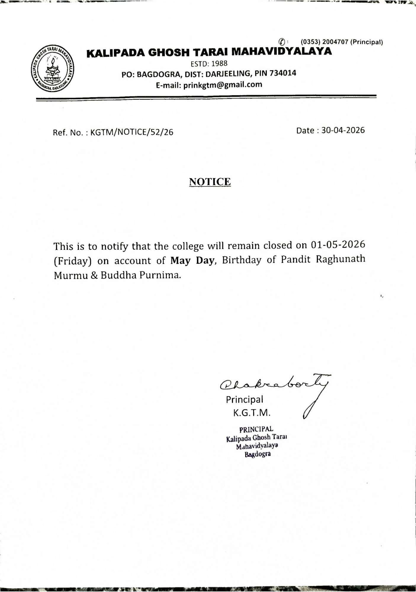 Kalipada Ghosh Tarai Mahavidyalaya, P.O. Bagdogra, Dist. Darjeeling, West Bengal, India-734014