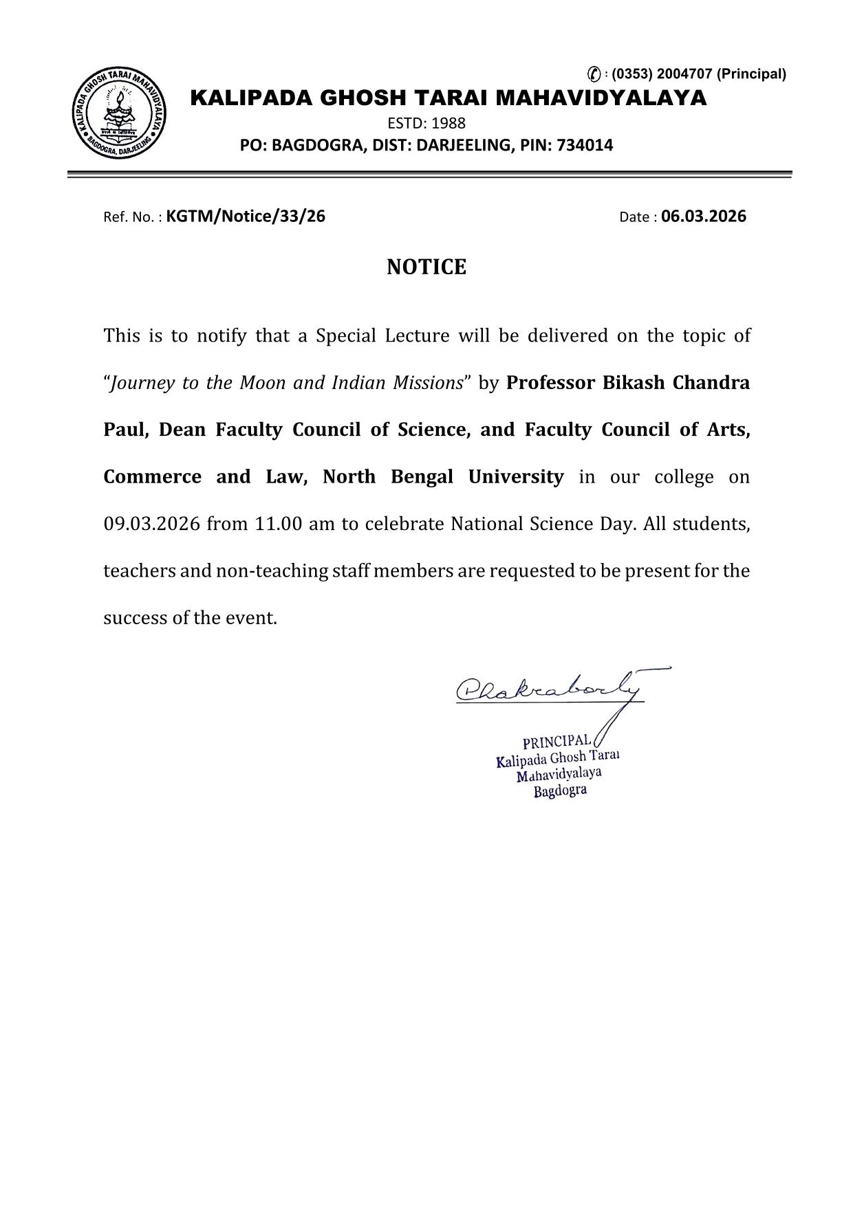Kalipada Ghosh Tarai Mahavidyalaya, P.O. Bagdogra, Dist. Darjeeling, West Bengal, India-734014