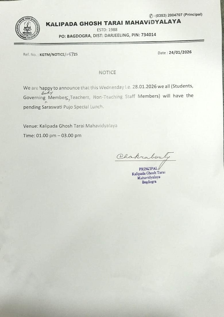 Kalipada Ghosh Tarai Mahavidyalaya, P.O. Bagdogra, Dist. Darjeeling, West Bengal, India-734014