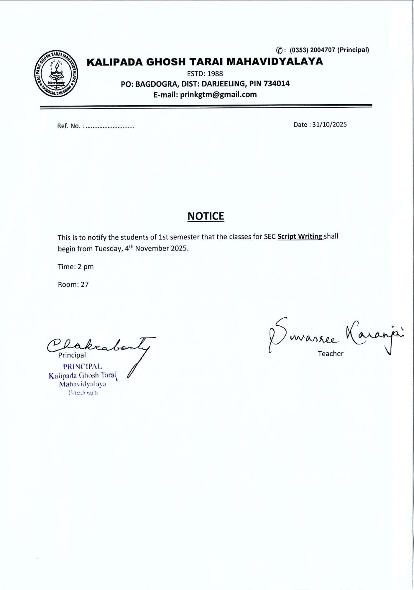 Kalipada Ghosh Tarai Mahavidyalaya, P.O. Bagdogra, Dist. Darjeeling, West Bengal, India-734014