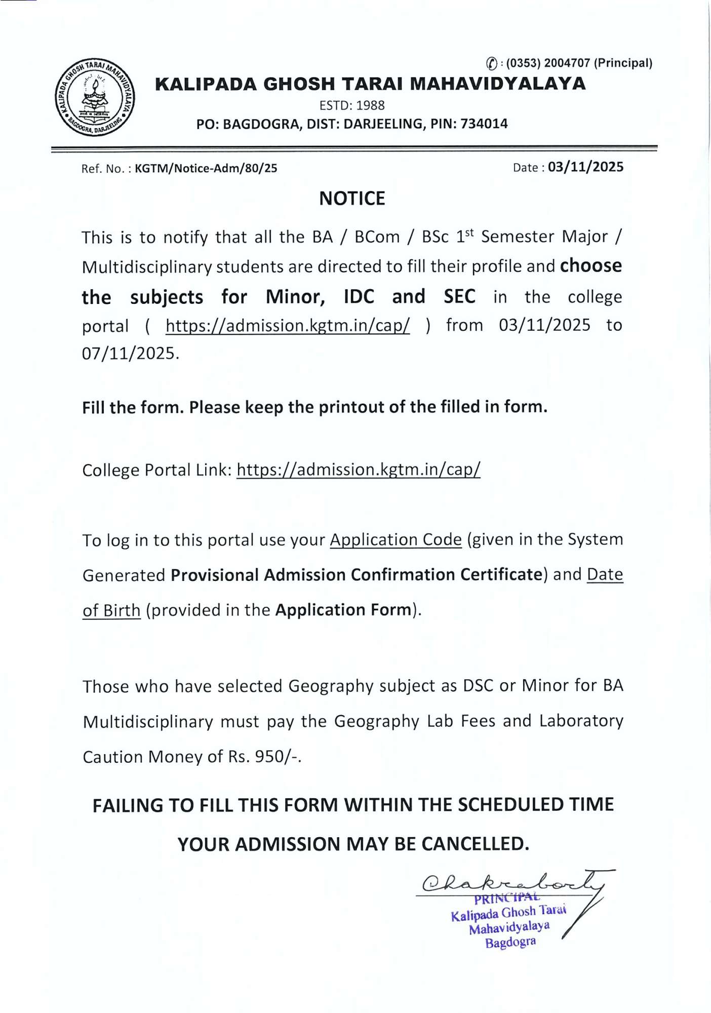 The Students are requested to select aditional SEC, IDC, AEC and VAC subjects at college portal. This is applicable for WBCAP Admitted candidates only.