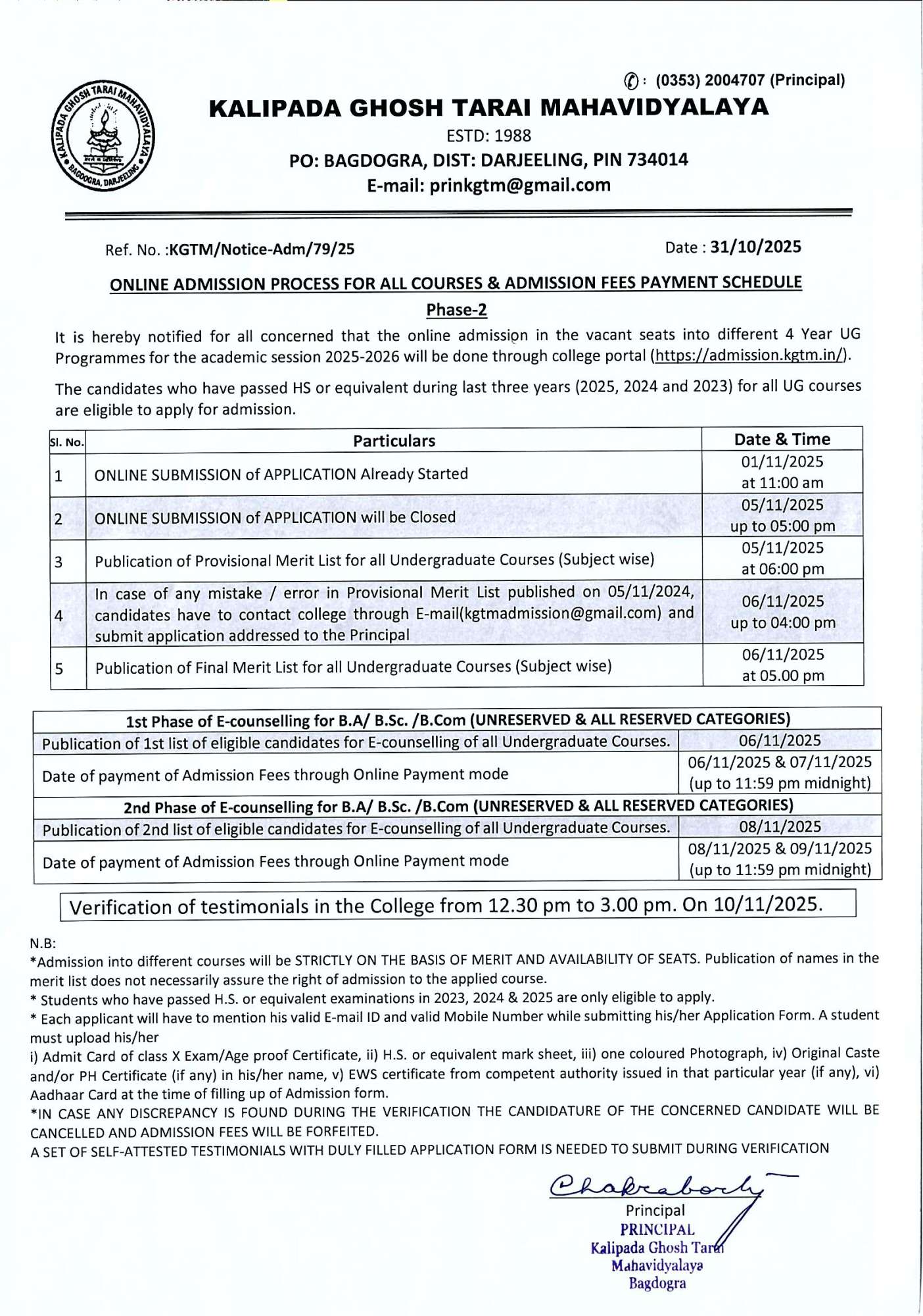 Tentative Admission Schedule 2025 for Phase-2