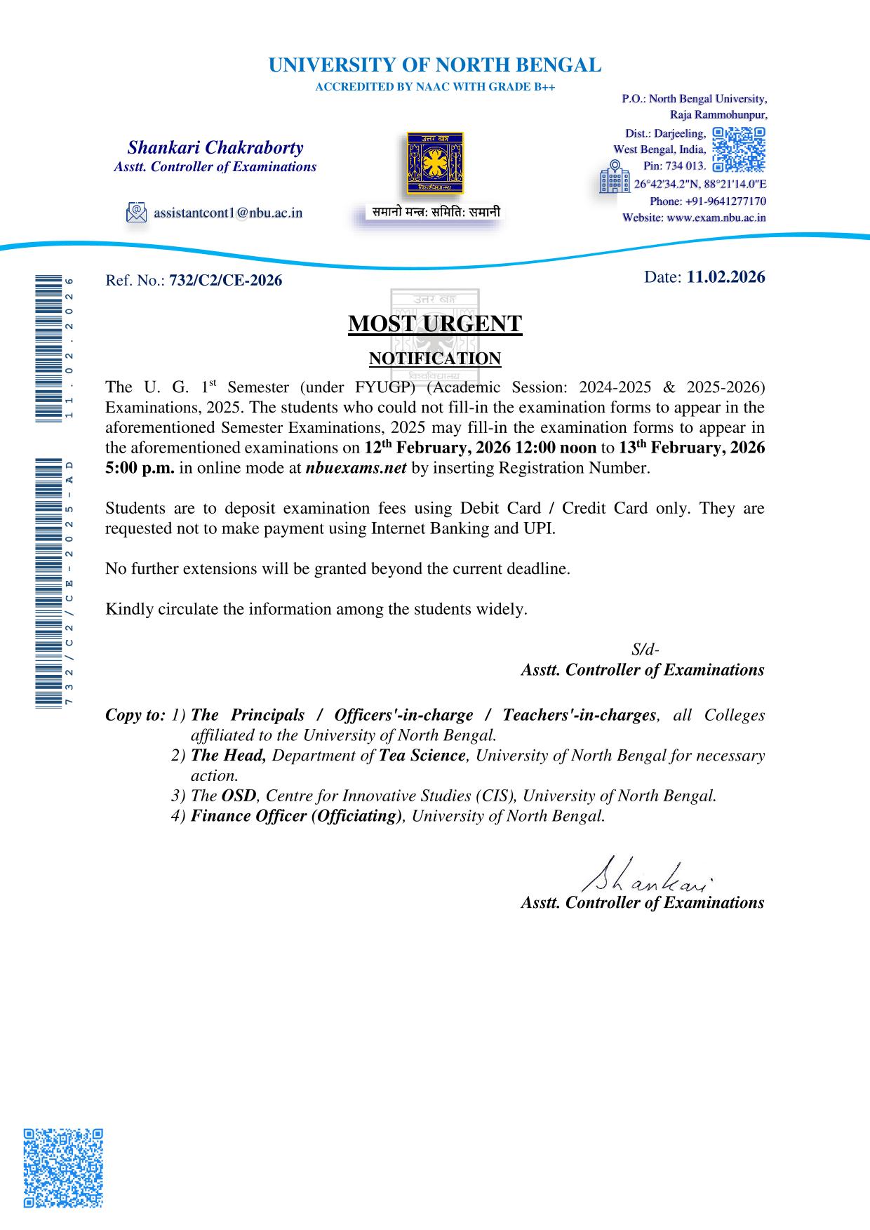 1st Sem NBU Final Exam Form fill-up Date Extension