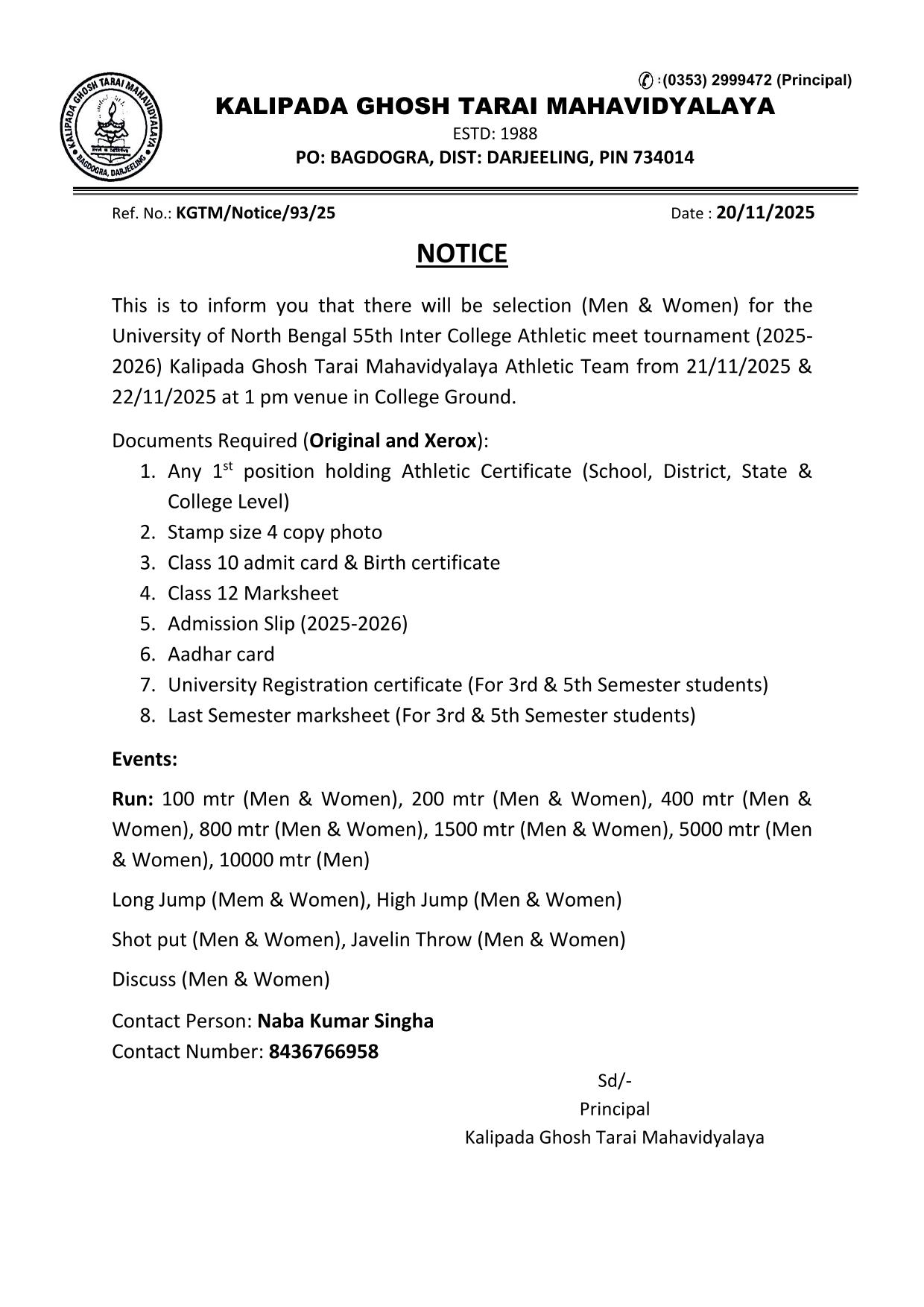 Kalipada Ghosh Tarai Mahavidyalaya, P.O. Bagdogra, Dist. Darjeeling, West Bengal, India-734014
