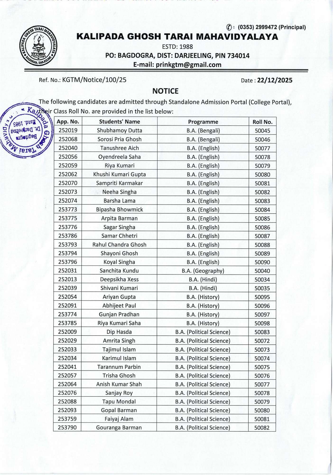 Kalipada Ghosh Tarai Mahavidyalaya, P.O. Bagdogra, Dist. Darjeeling, West Bengal, India-734014