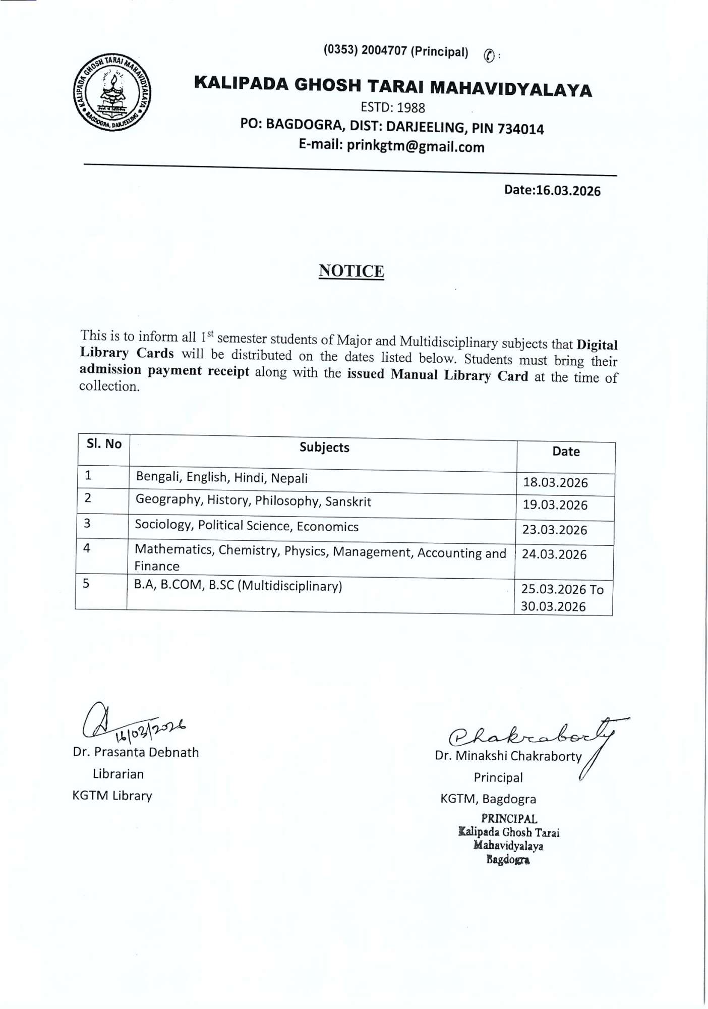 Kalipada Ghosh Tarai Mahavidyalaya, P.O. Bagdogra, Dist. Darjeeling, West Bengal, India-734014