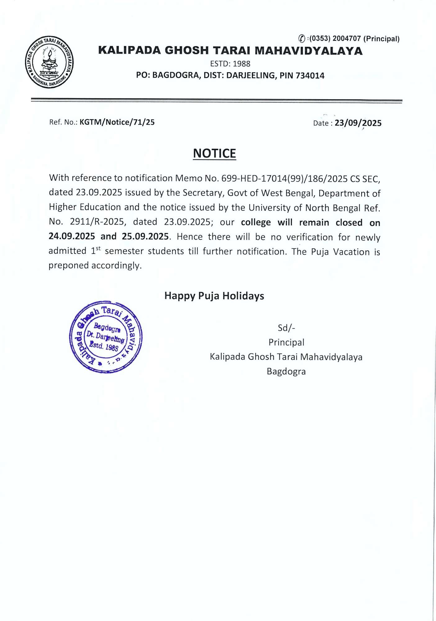 Kalipada Ghosh Tarai Mahavidyalaya, P.O. Bagdogra, Dist. Darjeeling, West Bengal, India-734014
