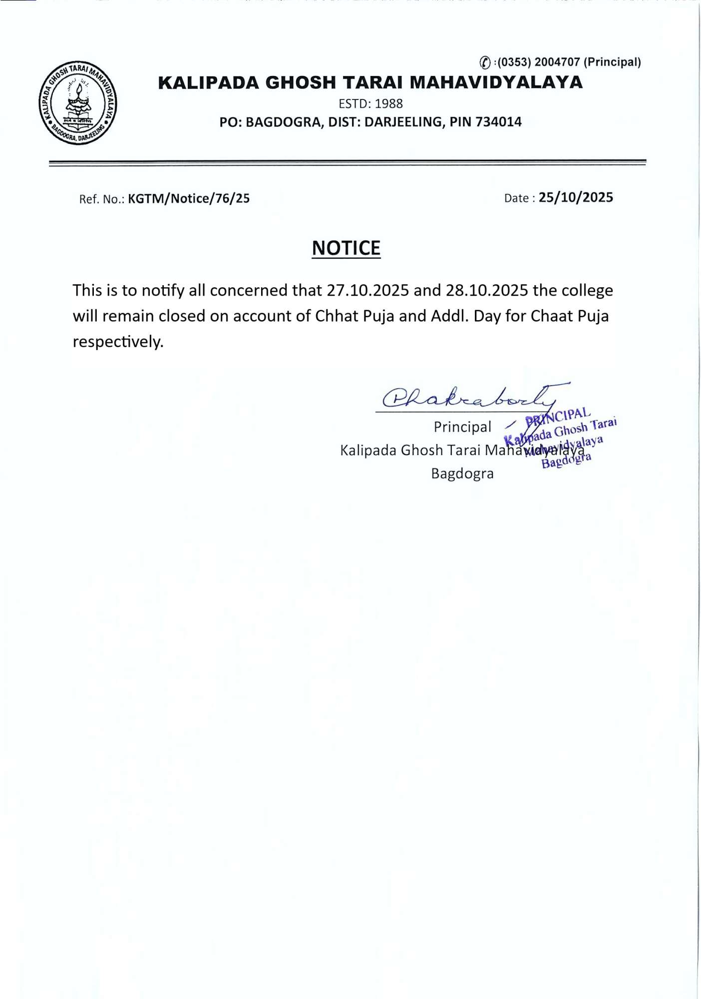 Kalipada Ghosh Tarai Mahavidyalaya, P.O. Bagdogra, Dist. Darjeeling, West Bengal, India-734014