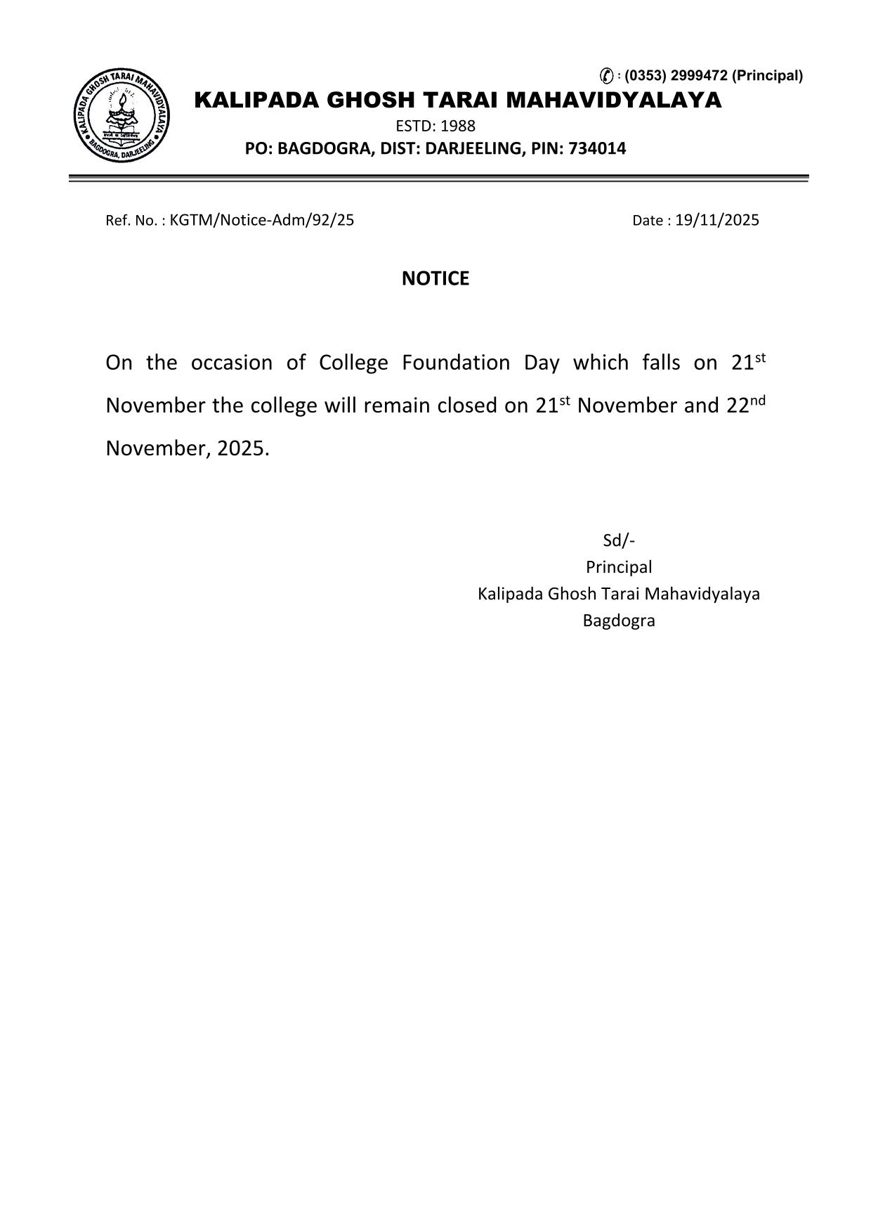 Kalipada Ghosh Tarai Mahavidyalaya, P.O. Bagdogra, Dist. Darjeeling, West Bengal, India-734014