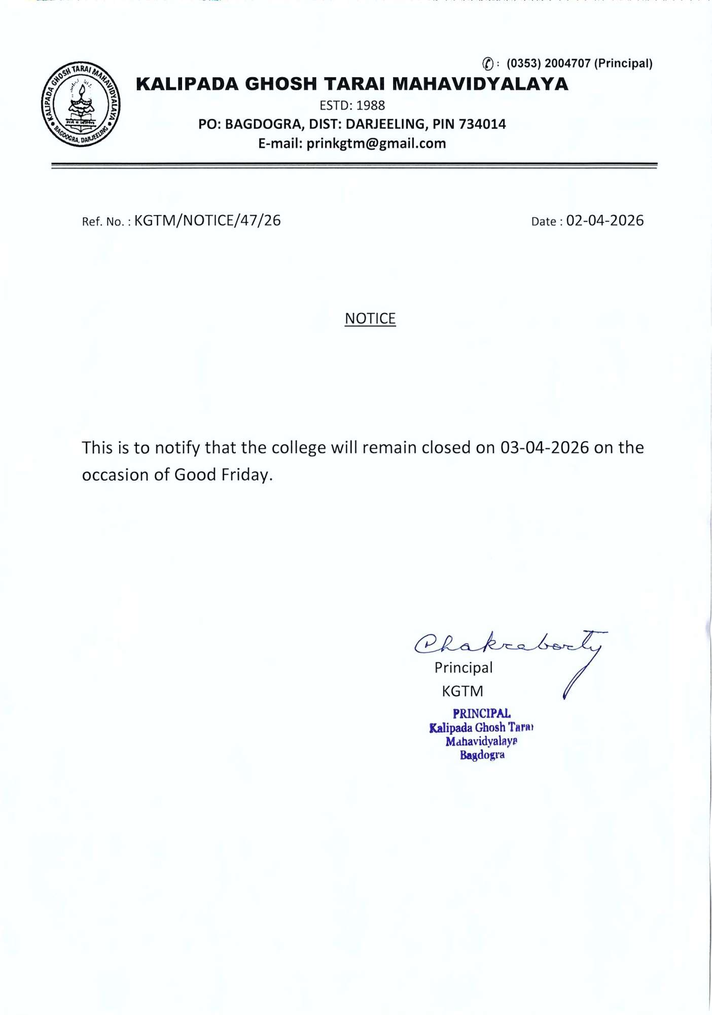 Kalipada Ghosh Tarai Mahavidyalaya, P.O. Bagdogra, Dist. Darjeeling, West Bengal, India-734014