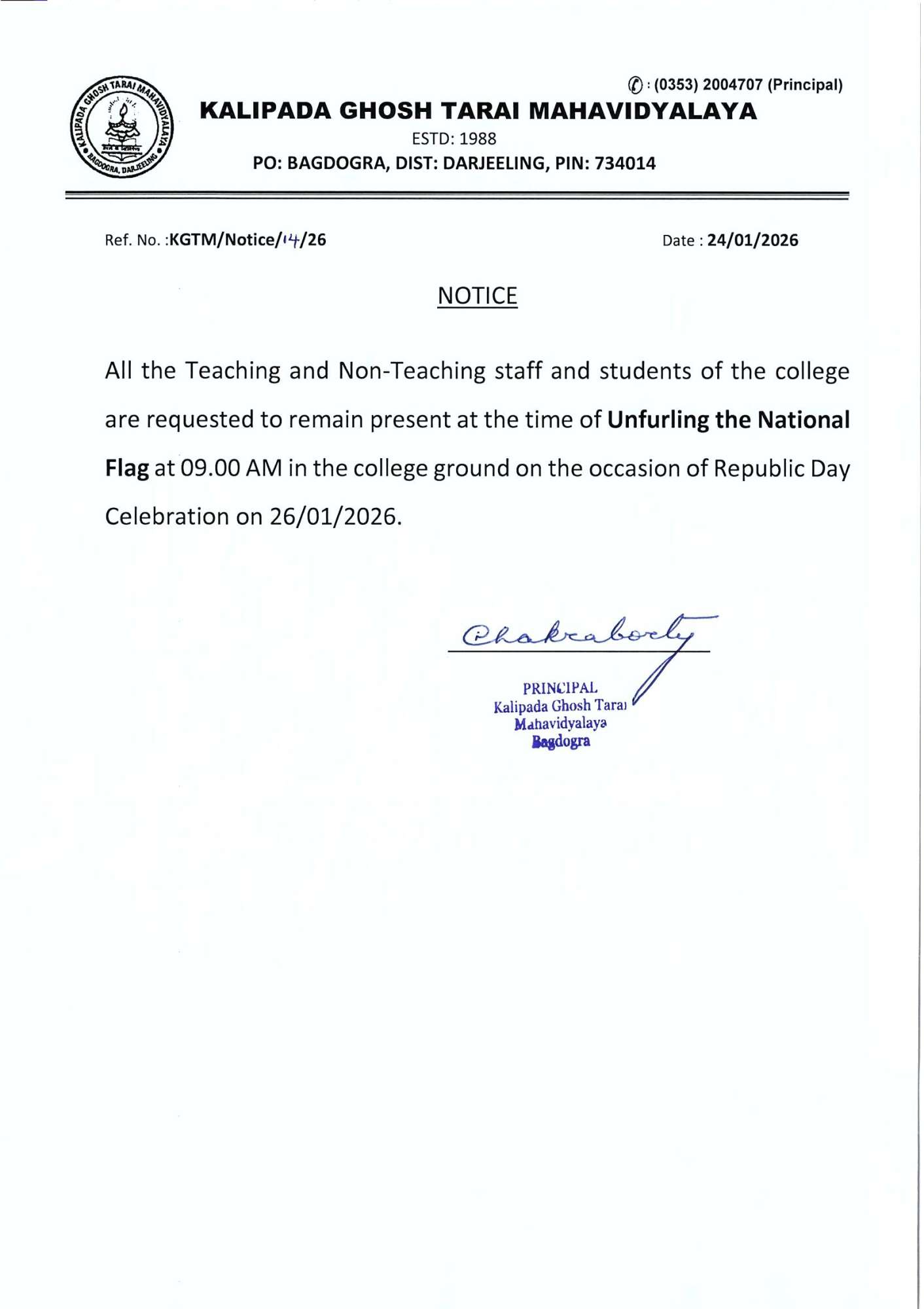 Kalipada Ghosh Tarai Mahavidyalaya, P.O. Bagdogra, Dist. Darjeeling, West Bengal, India-734014