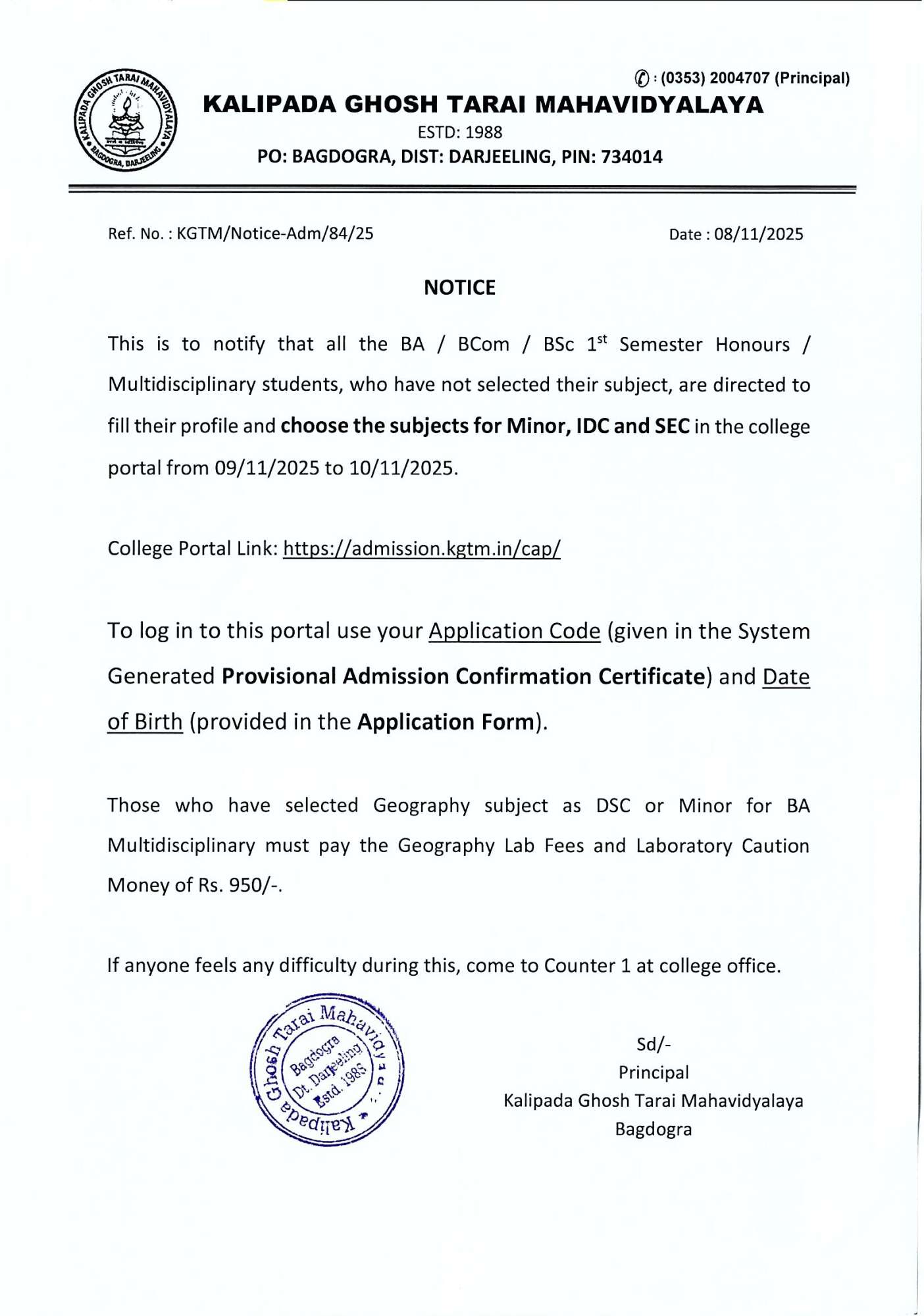 Kalipada Ghosh Tarai Mahavidyalaya, P.O. Bagdogra, Dist. Darjeeling, West Bengal, India-734014