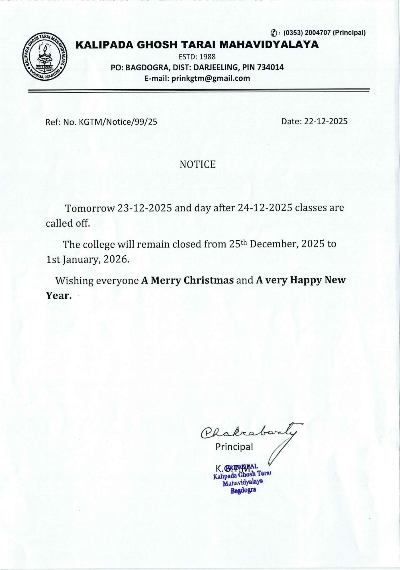 Kalipada Ghosh Tarai Mahavidyalaya, P.O. Bagdogra, Dist. Darjeeling, West Bengal, India-734014